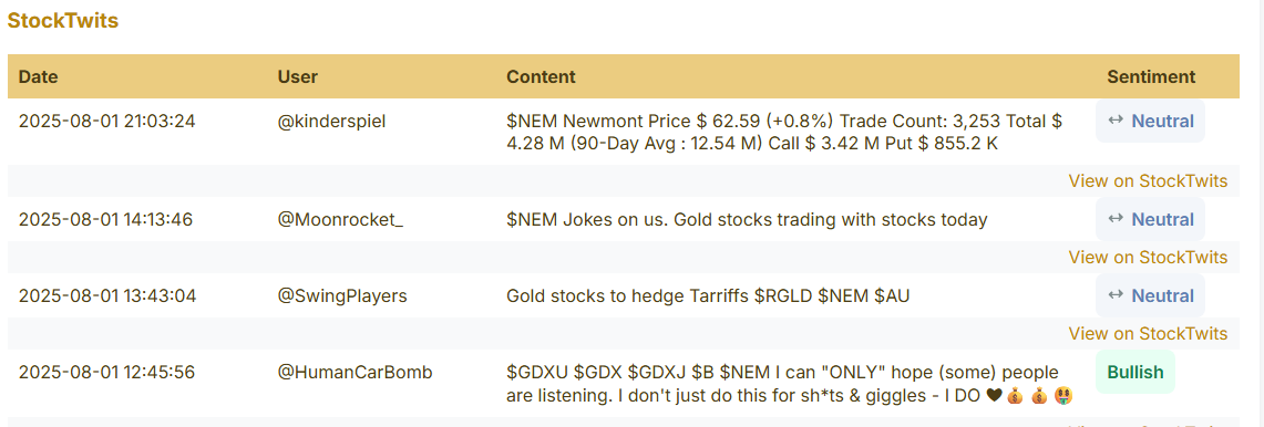 It monitors the dedicated investor community on StockTwits, capturing everything from price updates to trading sentiment like : "$NEM Newmont Price $ 62.59 (+0.8%) Trade Count: 3,253" and emotional reactions like "$GDXU $GDX $GDXJ $B $NEM I can 'ONLY' hope (some) people are listening. I don't just do this for sh*ts & giggles" (Bullish sentiment).