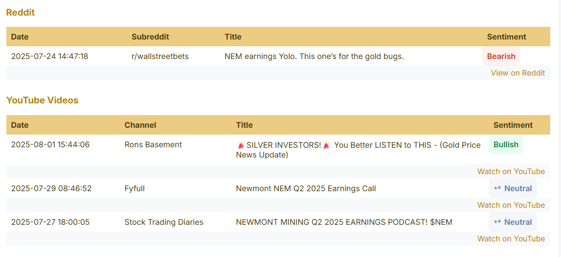 The MineVantage app dives into relevant subreddits like r/wallstreetbets to capture retail sentiment: "NEM earnings Yolo. This one's for the gold bugs" (Bearish sentiment) - giving us insight into how retail traders are positioning right now.