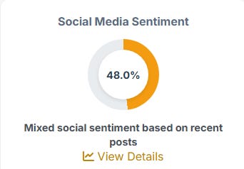 The MineVantage app provides me an instant sentiment overview - in this case showing a 48% middling mixed bag sentiment for this mining stock based on recent social media posts.