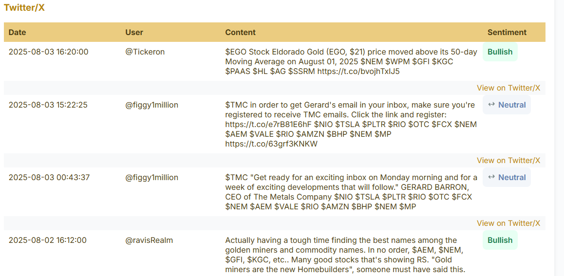 The MineVantage app captures real-time discussions from financial Twitter/X, including technical analysis observations like this: "@Tickeron: $EGO Stock Eldorado Gold (EGO, $21) price moved above its 50-day Moving Average" (Bullish sentiment) - which is found in the above picture.