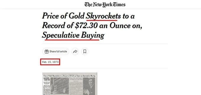 On February 15, 1973, The New York Times published an article titled, “Price of Gold Skyrockets to a Record of $72.30 an Ounce on, Speculative Buying.”